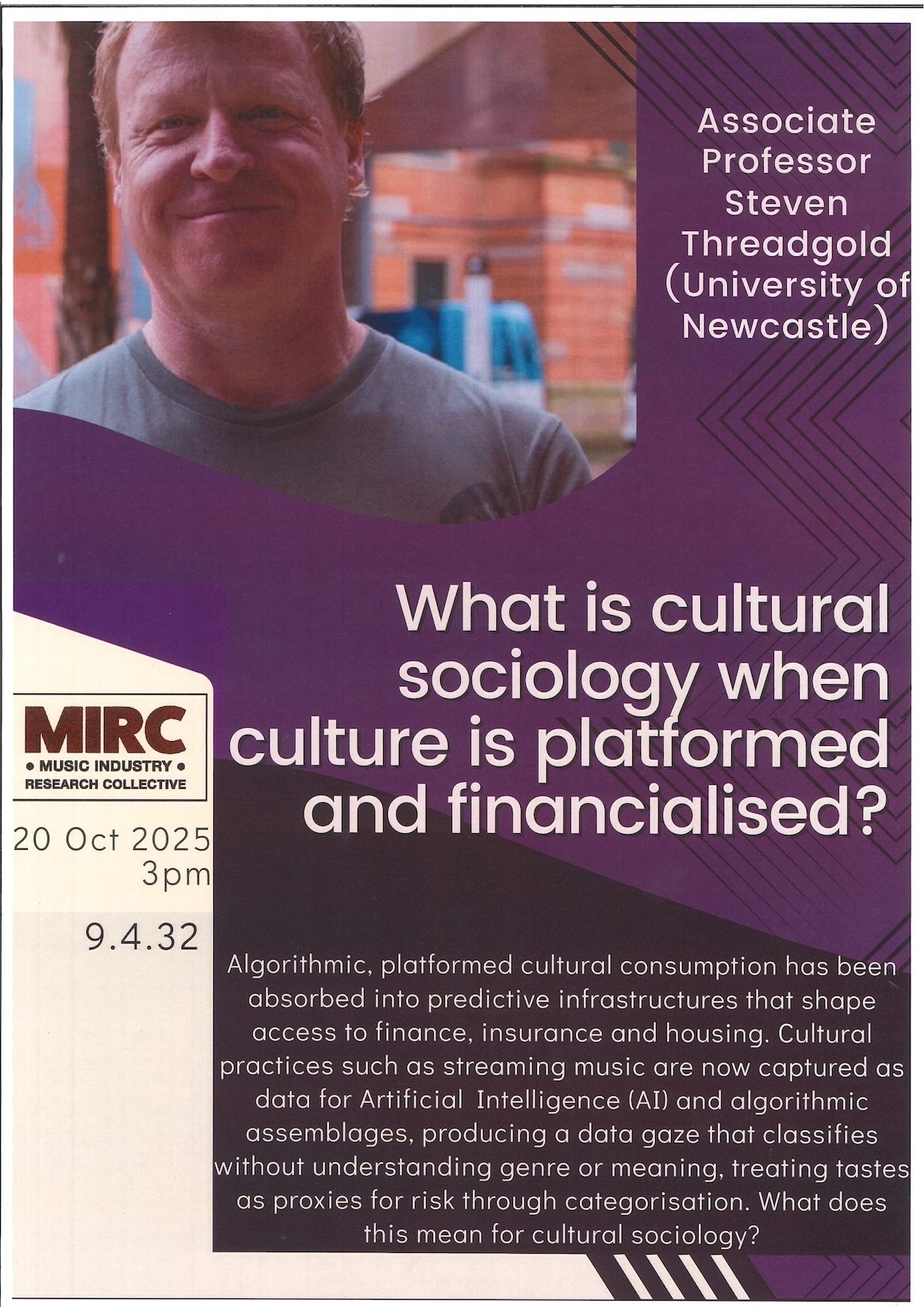 Algorithmic, platformed cultural consumption has been absorbed into predictive infrastructures that shape access to finance, insurance and housing. Cultural practices such as streaming music are now captured as data for Artificial Intelligence (AI) and algorithmic assemblages, producing a data gaze that classifies without understanding genre or meaning, treating tastes as proxies for risk through categorisation. What does this mean for cultural sociology?